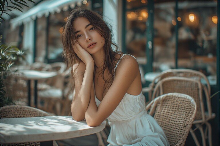 At first, everything seemed ordinary. She leaned back in her chair, glanced around at the passing people, and tapped her fingers lightly on the table as if listening to music only she could hear. The aroma of fresh coffee floated through the air, and the café scene felt peaceful and calm.